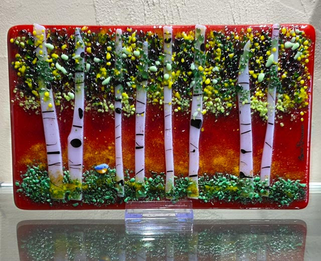 For 60 years, this passion for art lay dormant, but upon retirement, her true calling was unveiled: transforming sheets of glass into captivating art. Sue specializes in crafting vibrant kiln-formed landscapes, focusing on the intricate beauty of flowers and trees. Each petal and branch is hand-cut, allowing her creativity to flow naturally and organically.