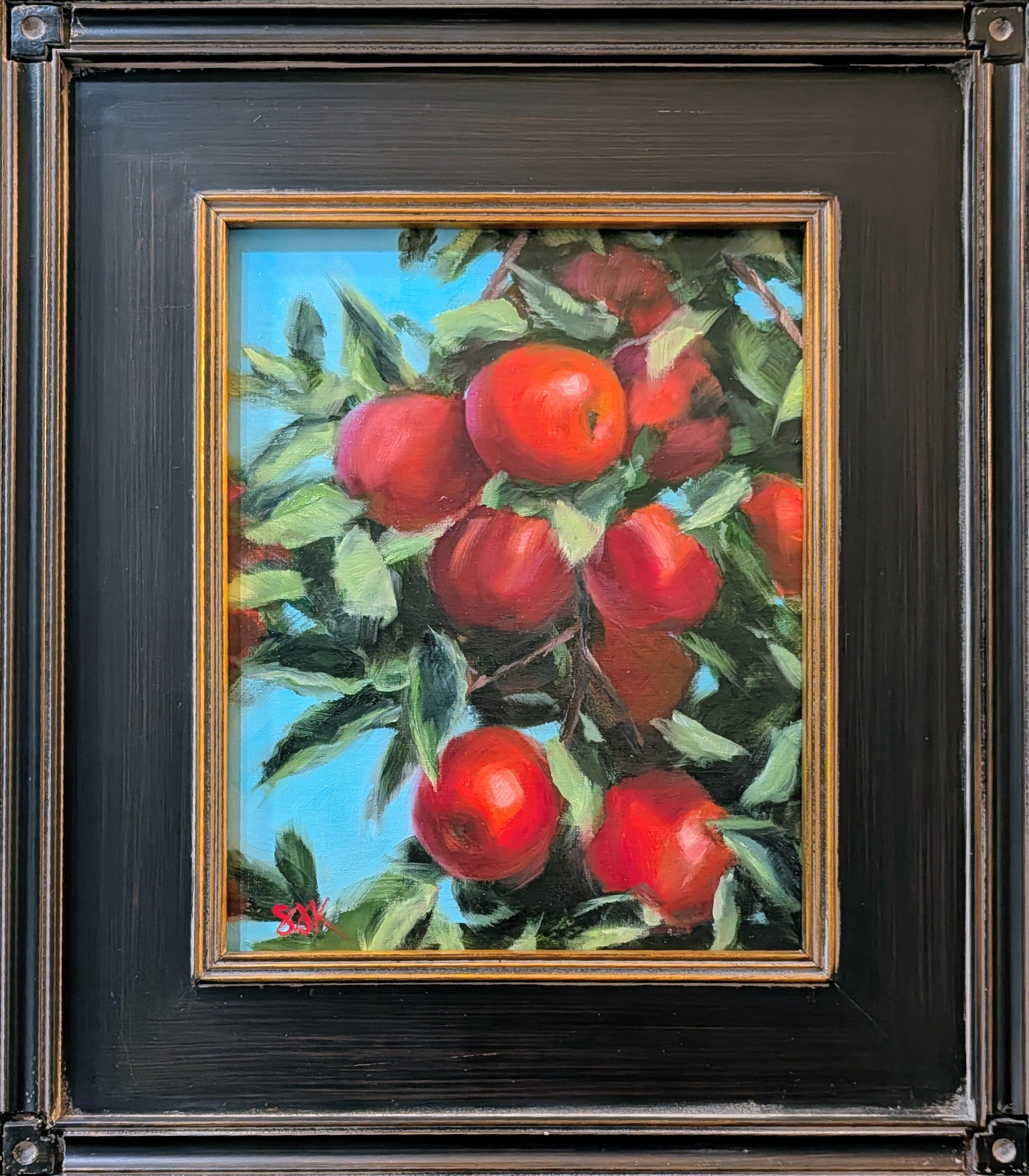 Growing up, Sarah Jane Keiser explored a life outdoors. The unique landscape where she was raised – the stark shift from glacial flattened land to moraine hills and valleys – filled her outdoor escapades, and in turn, her imagination. As a child, Keiser would lay in the grass and watch adventures of ants, then roll on her back and see rabbits and whales in the clouds. She would peer over a boat into a deep lake, and see a marvelous blue-green-black punctuated by the silver of a bluegill fish. Later, Keiser's medical career sophisticated my observational skills, yet she continued to seek respite outside. Her intent with oil painting is to encourage curiosity, and inspire joy and appreciation for our natural world. This painting was created during the 2025 harvest season.