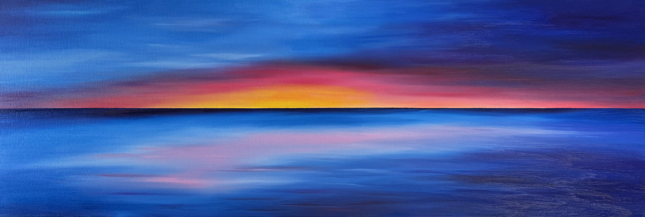 At the End of the Day features still blue waters with the sunset beyond the horizon, evoking feelings of calm, freedom, and connection to nature. The rich backgrounds and subtle reflections invite viewers into a meditative, dreamlike world.