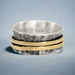 A hammered and oxidized sterling band forms the foundation, symbolizing the rugged terrain of life's journey. Two elegantly wrought spinners in 14kt gold fill dance with the wind, reminiscent of the sun's golden rays piercing through tumultuous clouds. The band, approximately 3/8" wide and subtly curved, ensures a snug embrace for the wearer's finger, marrying comfort with sophistication.