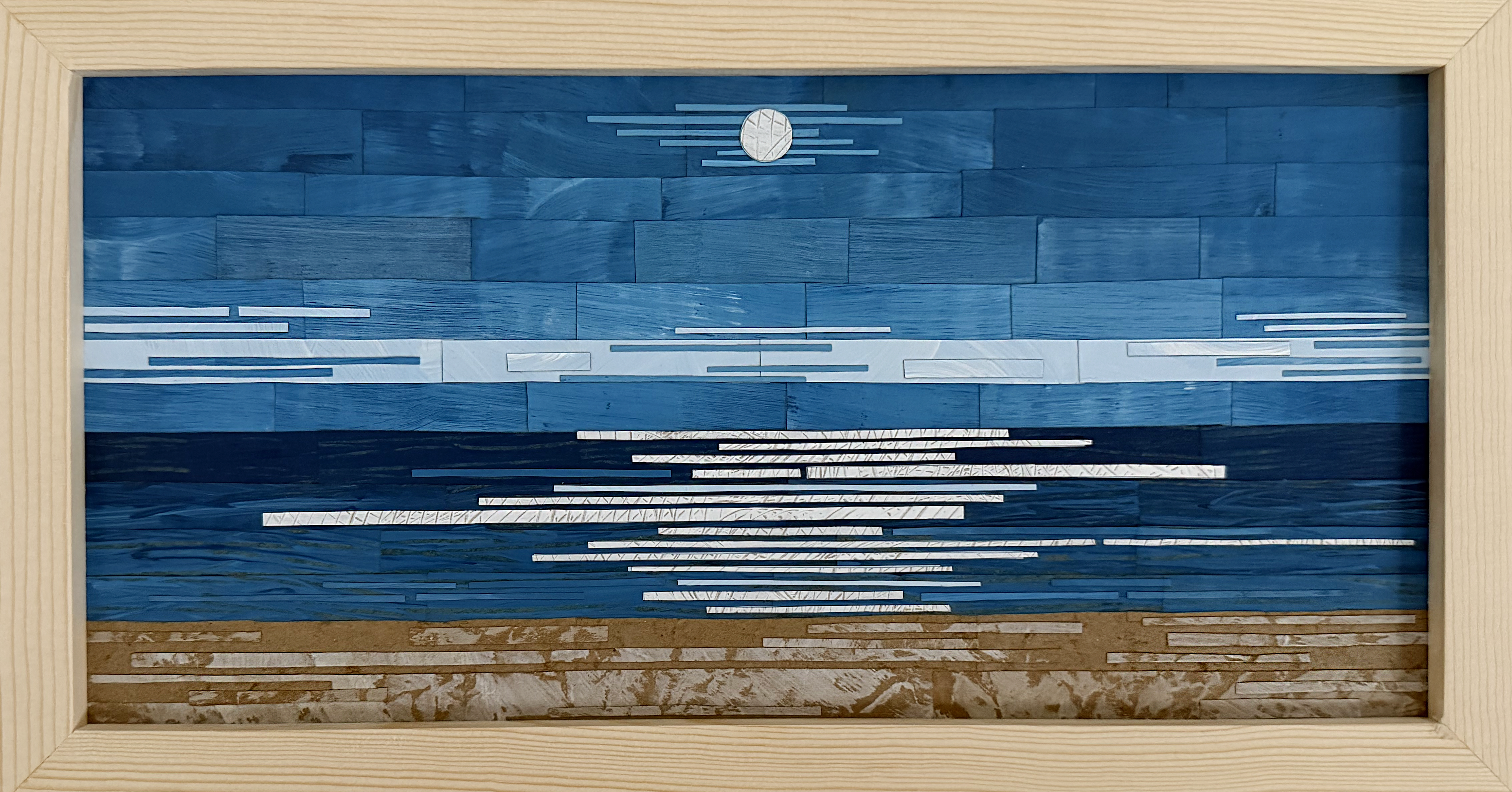 Sue Ellibee’s collage artwork is an extension of her lifelong work in graphic design. In her collage pieces, she uses elements of color and texture to create her own interpretation of nature. This artistic direction has given Ellibee the opportunity to apply her visual skills in a new way—interpreting and simplifying the natural landscape.