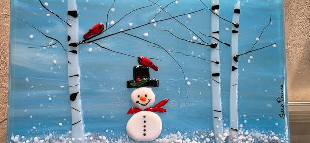 Sue Pruss totally loses all sense of time when immersed in her glass studio. She’ll look at a beautiful new sheet of glass and begin to imagine. Sometimes the texture or pattern ‘tells’ her what to create. Other times, it’s the blending of colors. But the most rewarding aspect of all, is the organic approach she takes in her creations.