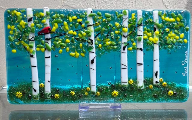 For 60 years, this passion for art lay dormant, but upon retirement, her true calling was unveiled: transforming sheets of glass into captivating art. Sue specializes in crafting vibrant kiln-formed landscapes, focusing on the intricate beauty of flowers and trees. Each petal and branch is hand-cut, allowing her creativity to flow naturally and organically.