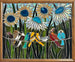 Each stained-glass mosaic is a one-of-a-kind created by artist Bonnie Nygard. Stained glass is cut into unique designs and adhered to the clear glass. These birds on a wire are admiring this beautiful garden that features blue agates.