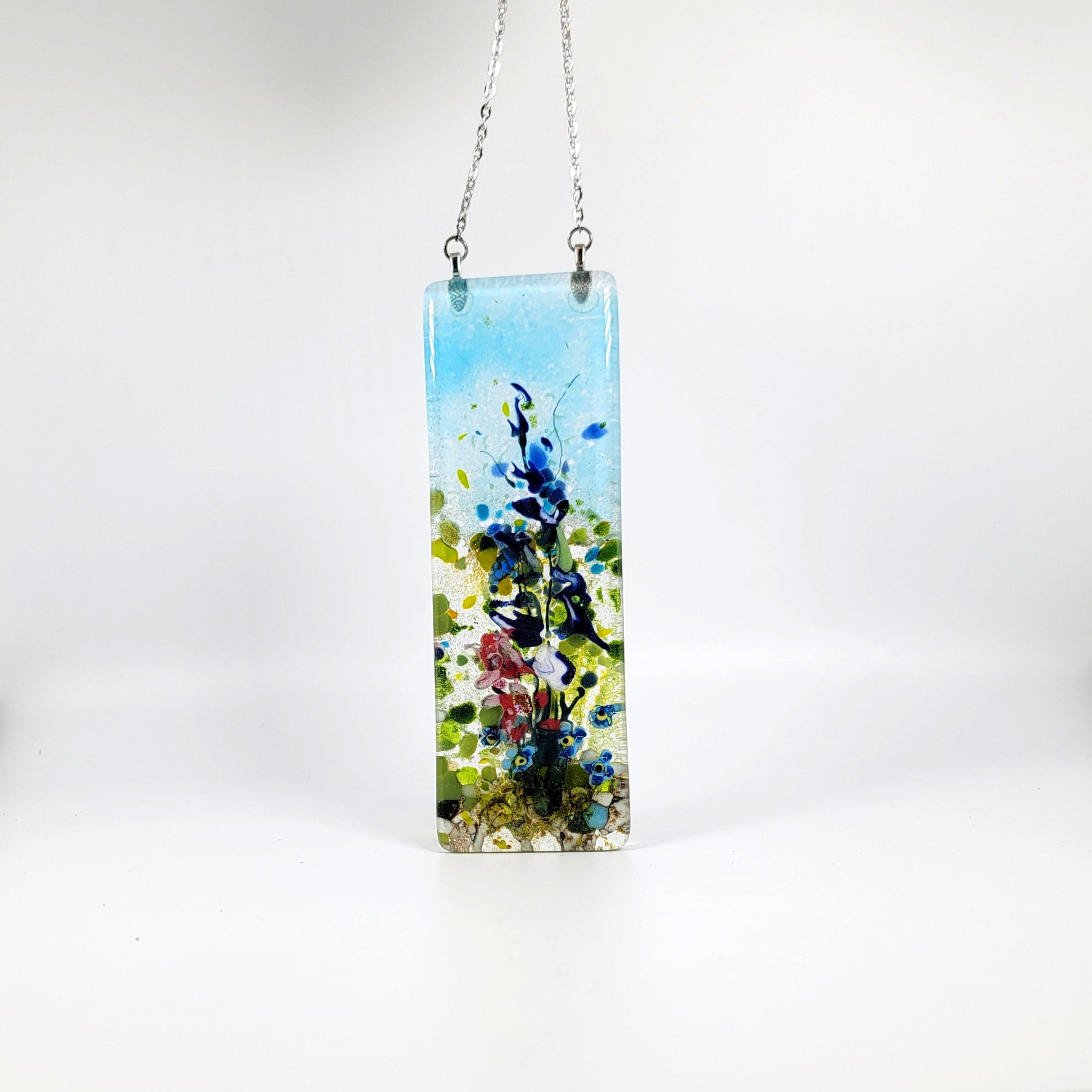 Tim McCoy and Kathy Marchlinski's hand painted, layered glass, fully fused hangers feature various wildflowers in beautiful opaque and transparent colors. Be reminded of wildflower covered fields year round while hanging this piece in your window.