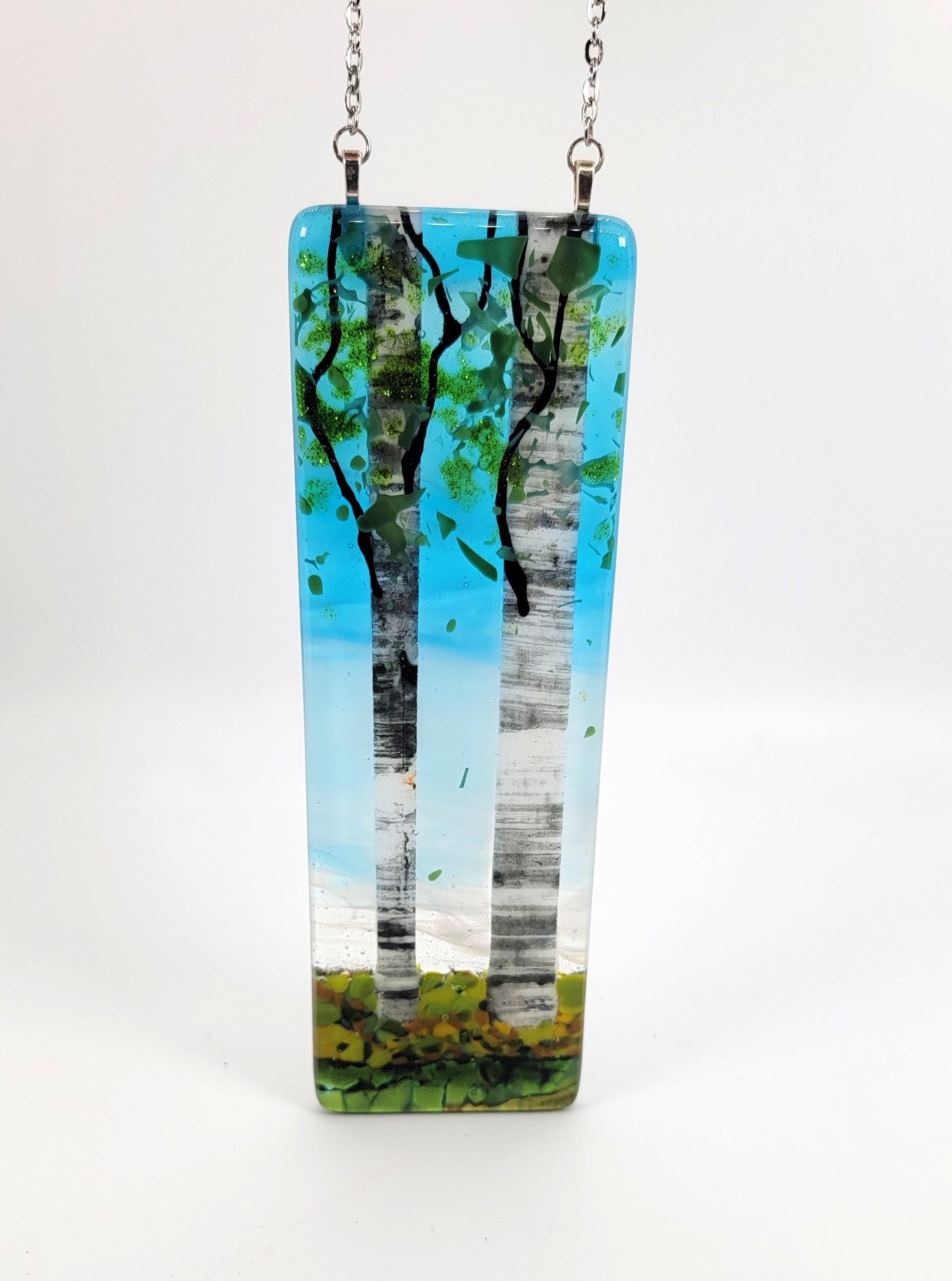 Tim McCoy and Kathy Marchlinski's hand painted, layered glass, fully fused plates feature various birch trees and wildflowers in beautiful opaque and transparent colors. Be reminded of birch tree forests year round while hanging this piece in your window.