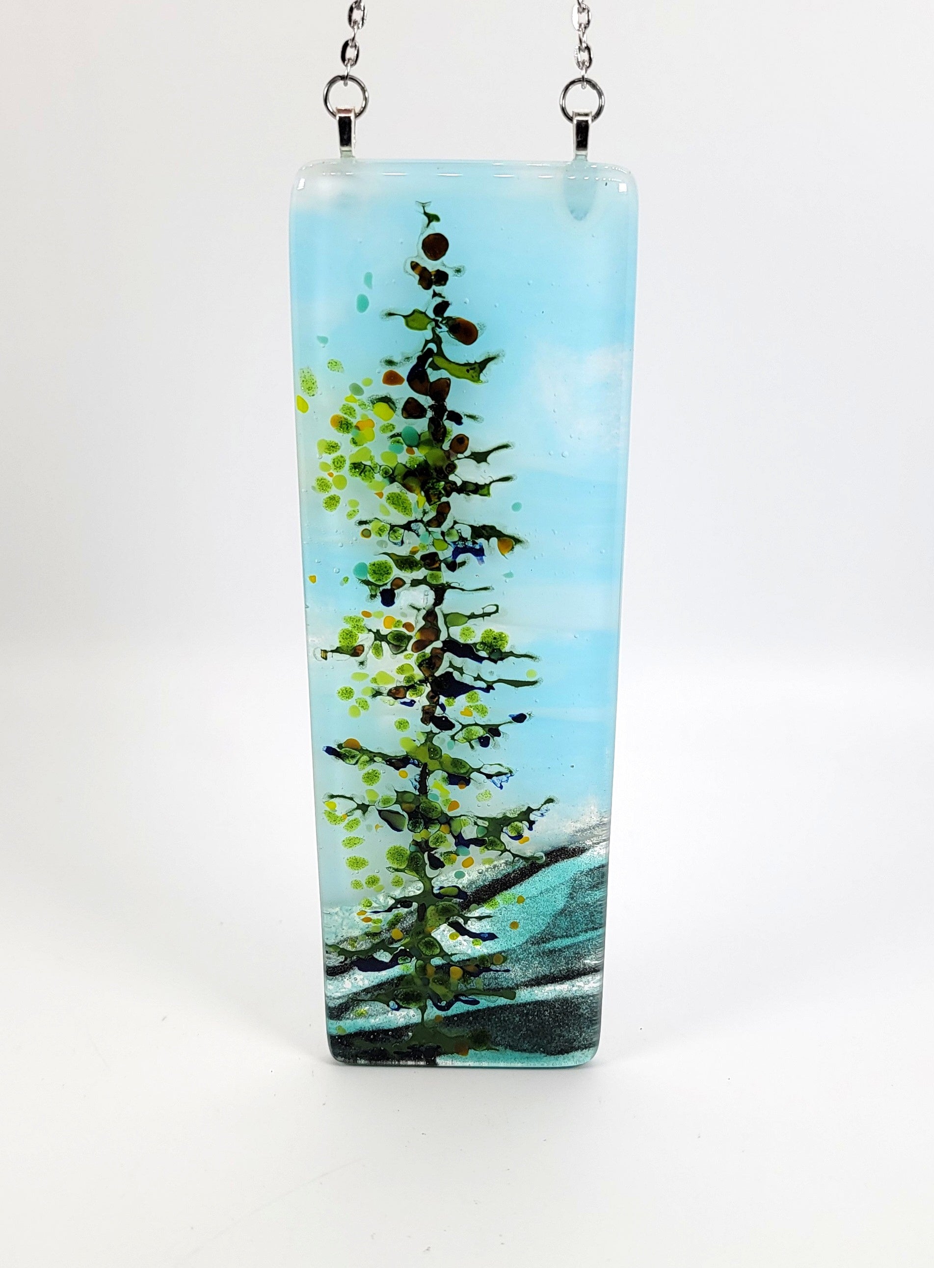 Tim McCoy and Kathy Marchlinski's hand painted, layered glass, fully fused hangers feature various spruce trees in beautiful opaque and transparent colors. Be reminded of spruce forests year round while hanging this piece in your window.