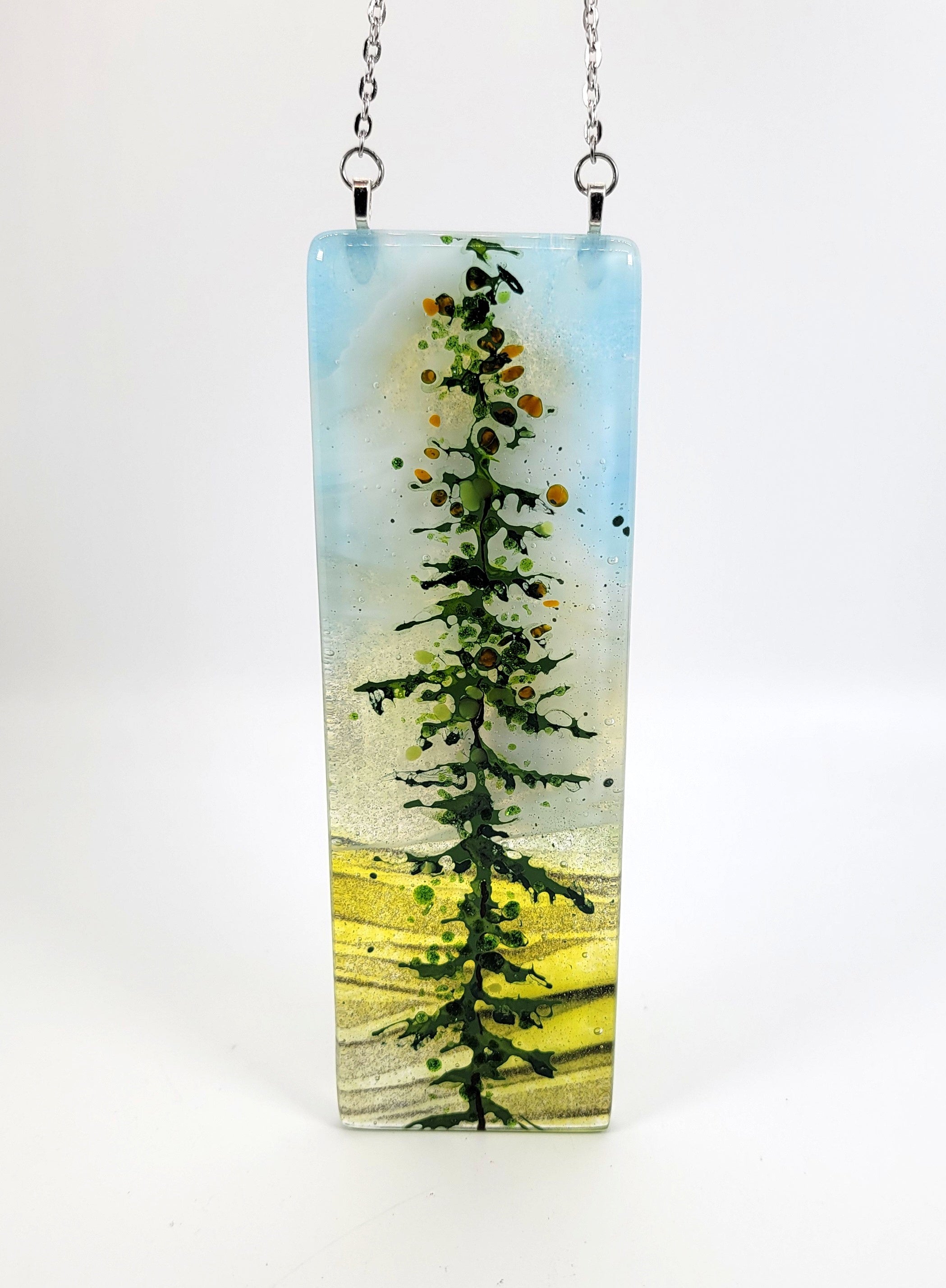 Tim McCoy and Kathy Marchlinski's hand painted, layered glass, fully fused hangers feature various spruce trees in beautiful opaque and transparent colors. Be reminded of spruce forests year round while hanging this piece in your window.