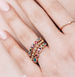 Delicately bezel set on a gold band is a rainbow mix of gemstones in assorted shapes. This streamlined neutral hued eternity ring adds an alluring and modern touch to both day and evening wear.