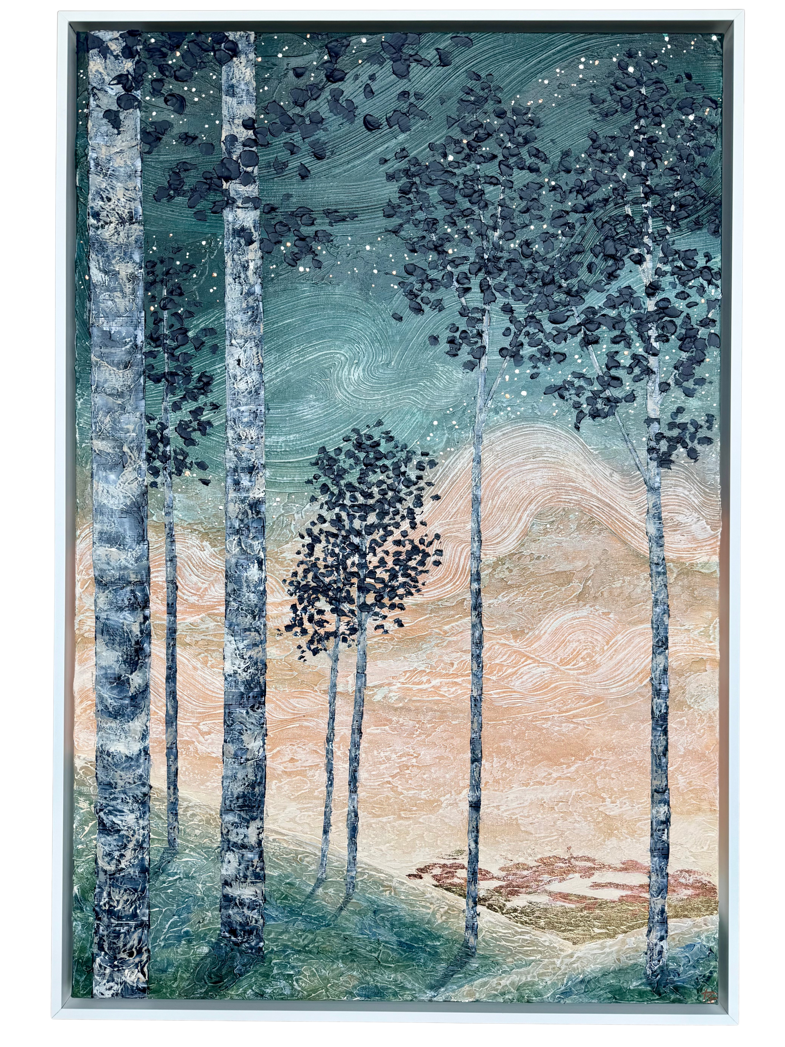 Trisha Spice’s newest acrylic collection captures the quiet magic of nature through bold texture and luminous color. With palette knife technique and layered brushwork, she brings landscapes to life—birch trees glow against swirling skies, and shorelines shimmer under soft sunset hues. Each piece is a tactile, painterly expression of the natural world, rooted in place and rich with emotion.
