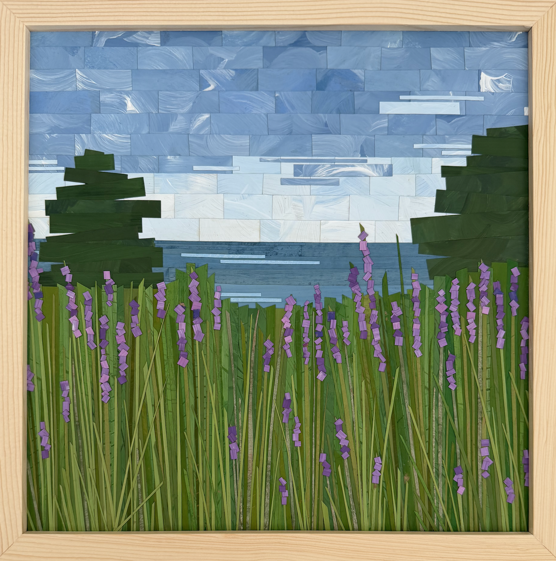 Sue Ellibee’s collage artwork is an extension of her lifelong work in graphic design. In her collage pieces, she uses elements of color and texture to create her own interpretation of nature. This artistic direction has given Ellibee the opportunity to apply her visual skills in a new way—interpreting and simplifying the natural landscape.