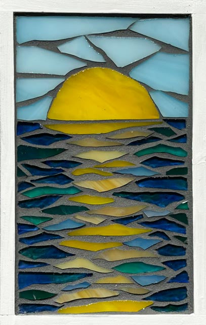 Each of Kellie’s pieces begins with a conversation between the artist and the glass. The texture, color, or cut of the material often guides the direction of the work, sometimes leading to unexpected and delightful outcomes. Her passion for mosaic art shines through in every piece, and she considers it the highest compliment when one of her creations finds a new home through the gallery.