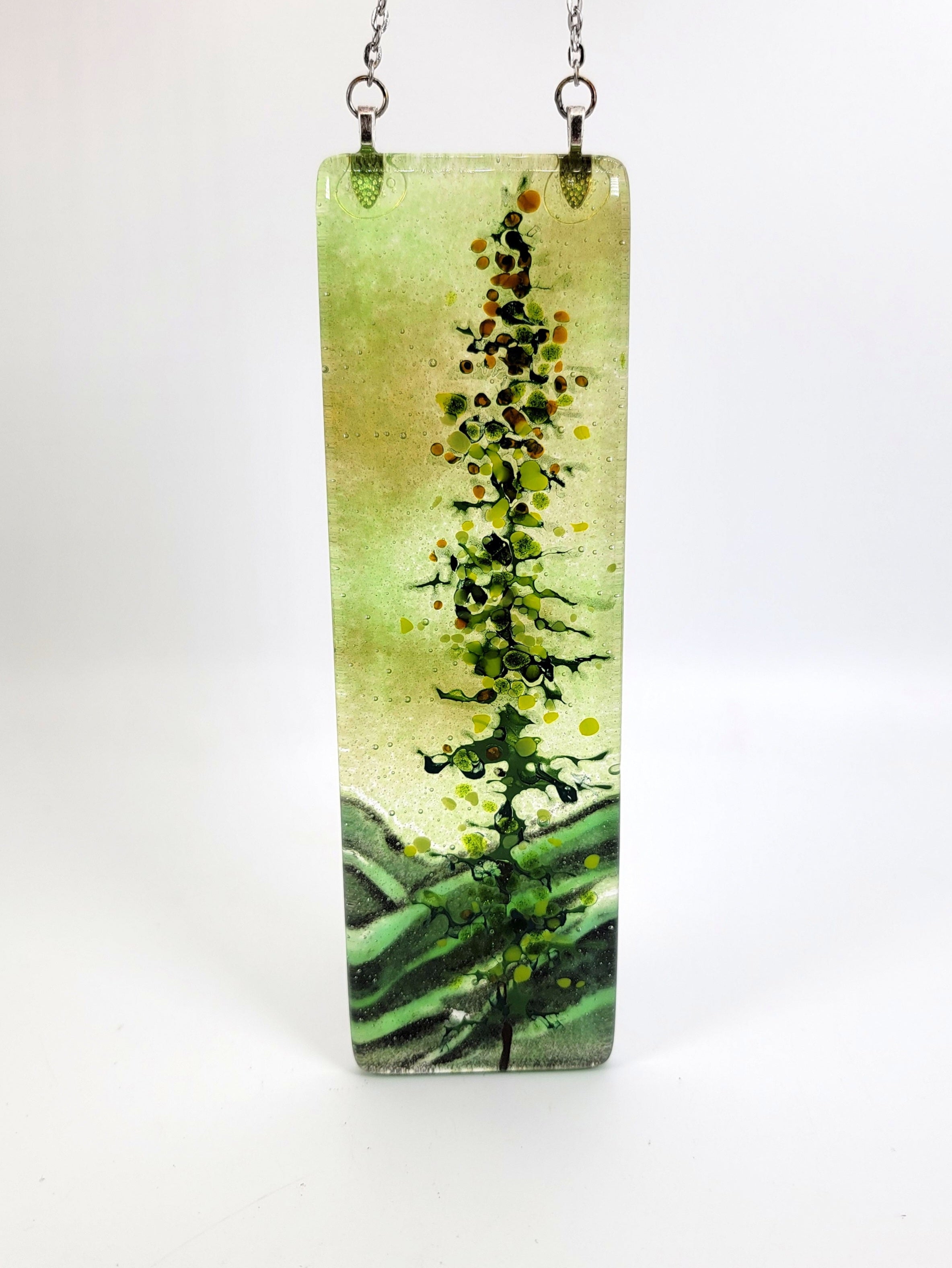 Tim McCoy and Kathy Marchlinski's hand painted, layered glass, fully fused hangers feature various spruce trees in beautiful opaque and transparent colors. Be reminded of spruce forests year round while hanging this piece in your window.