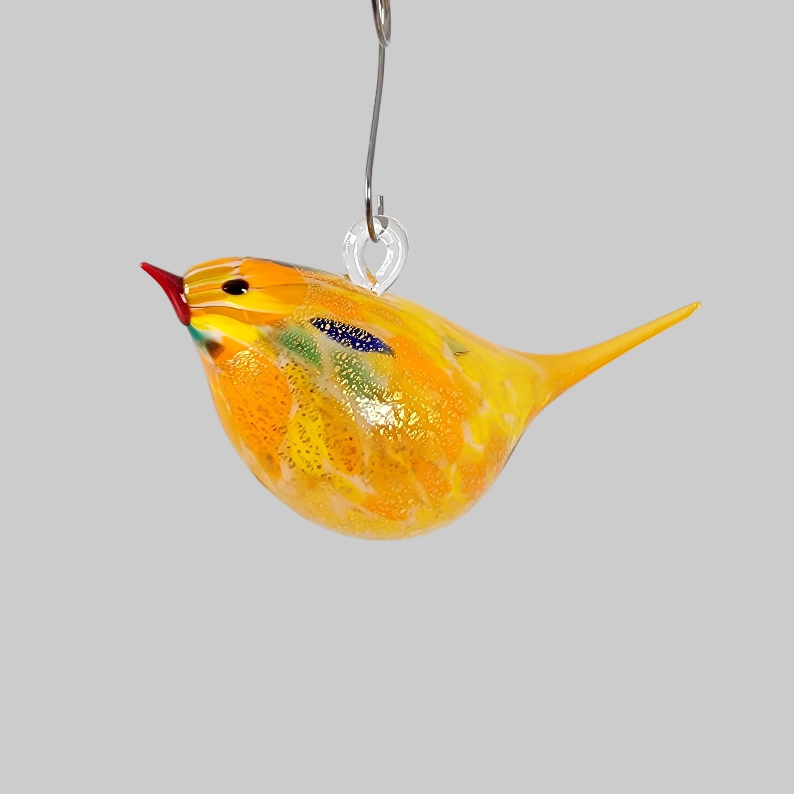 The artist took their best-selling, colorful birds, each a unique work of art crafted by skilled Murano artisans, now come with a glass loop, ready to take flight from your shelves and adorn your favorite spaces. These Chirpies do not sit on a table surface, and are intended for hanging only.