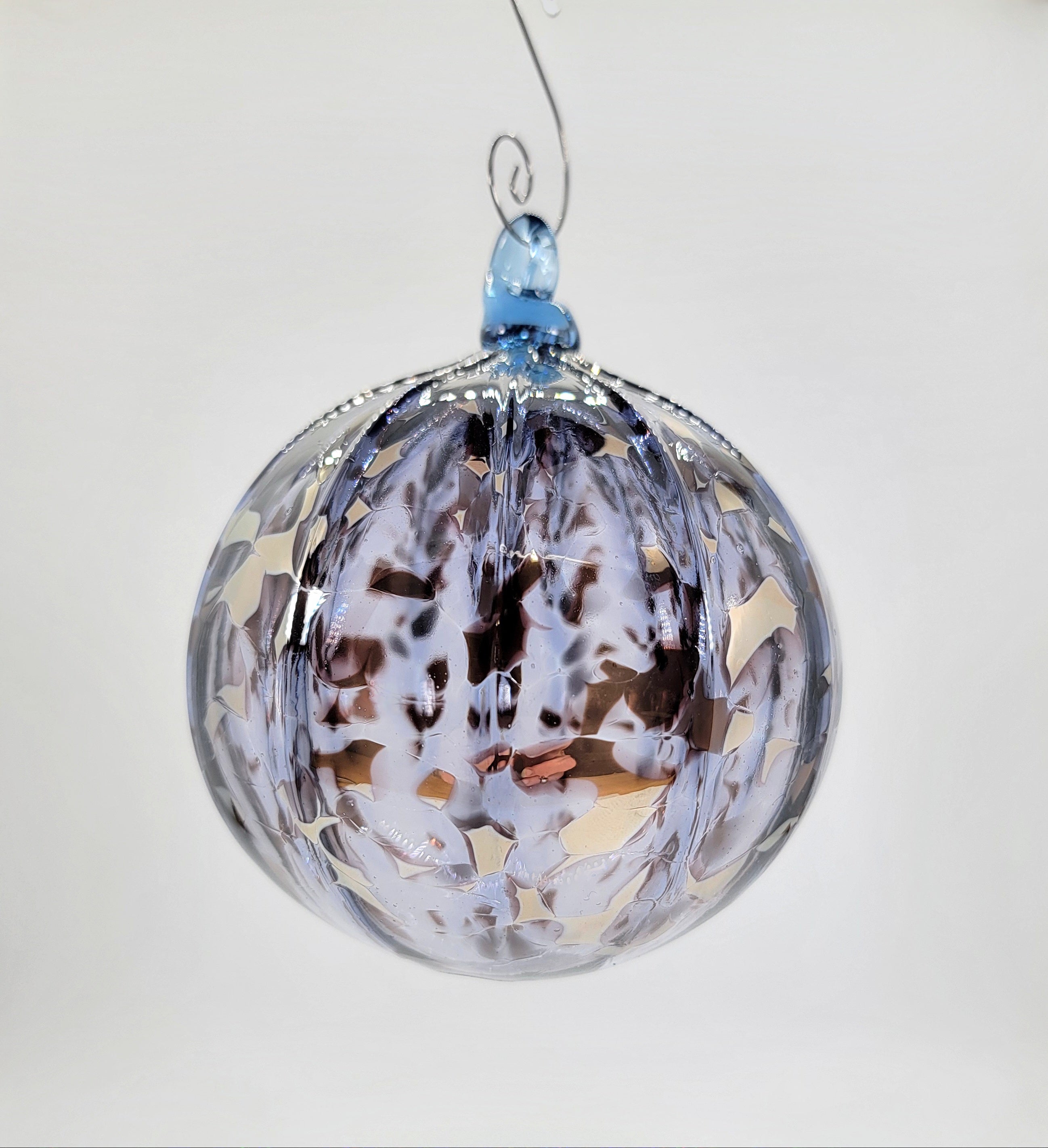The Heavy Metals Ornament has a smokey purple glass with metal toned accents.
