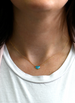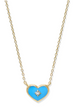 A bright turquoise enamel heart with a diamond center stone, suspended from a diamond cut yellow gold chain.