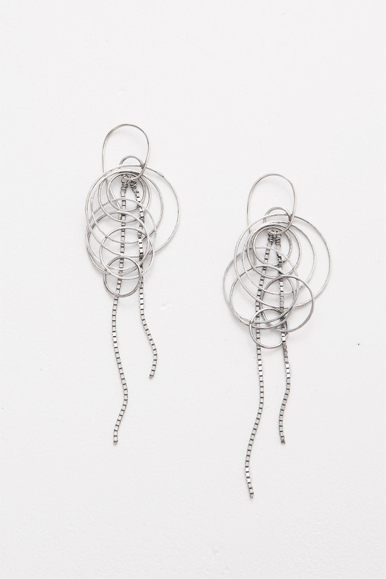 These unique earrings by Zuzana Korbelarova feature hand forged sterling silver hoops clustered together in a variety of sizes and hammered for a stunning texture that reflects light from every angle. The chain dangles and dances with movement, adding an extra element of charm to these already eye-catching earrings. Silver is patinaed and polished back up and the earrings are 3” long.