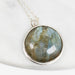 This necklace features a stunning a stunning labradorite that hangs in a hand hammered Sterling Silver pendant and sits on a 16" - 18" adjustable sterling silver chain.