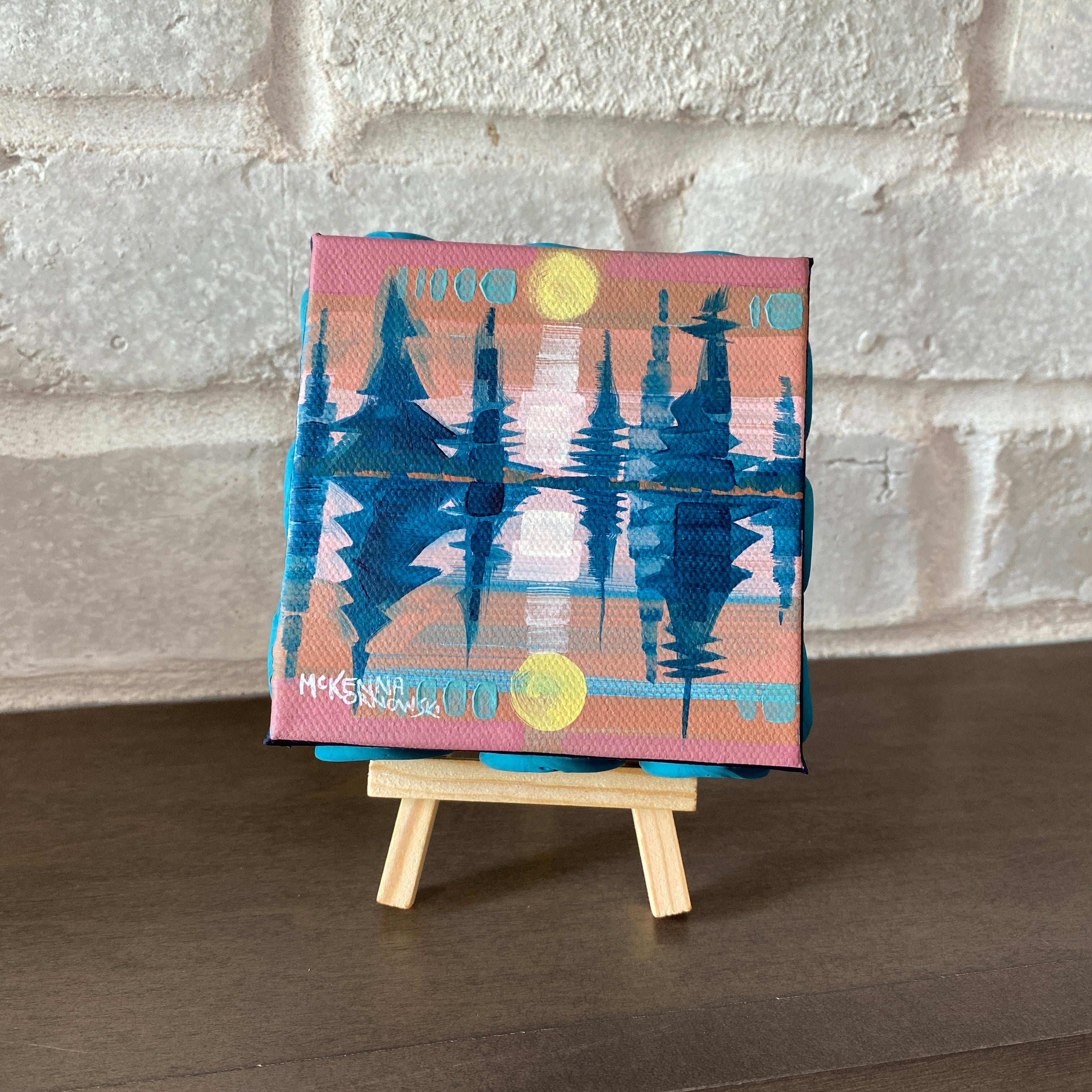 This painting can be hung on the wall or displayed on a wooden easel. It features a calming color pallet and scalloped edges.