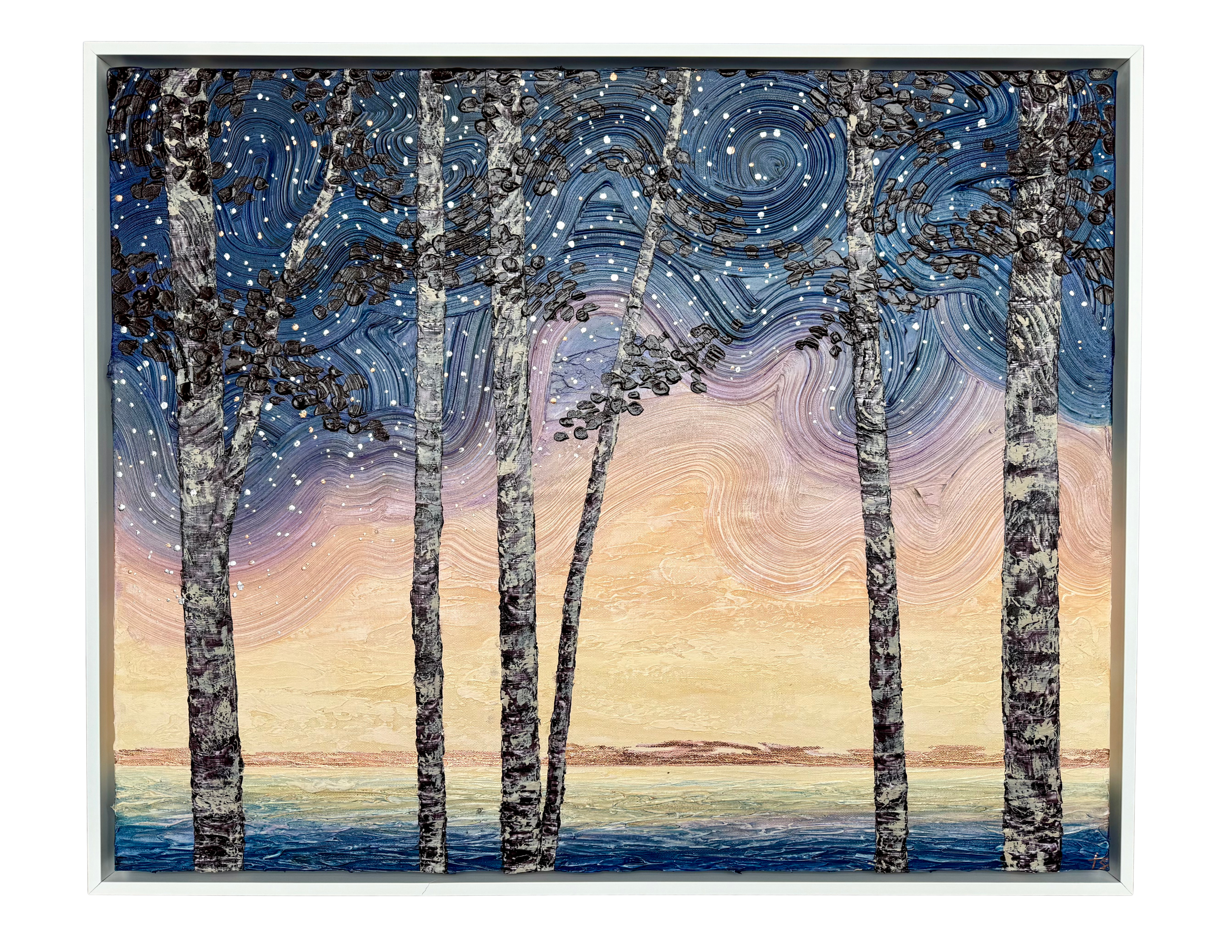 Trisha Spice’s newest acrylic collection captures the quiet magic of nature through bold texture and luminous color. With palette knife technique and layered brushwork, she brings landscapes to life—birch trees glow against swirling skies, and shorelines shimmer under soft sunset hues. Each piece is a tactile, painterly expression of the natural world, rooted in place and rich with emotion.