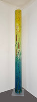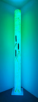The concept of a 360 degree painting intrigued Ray Zovar but had it's challenges. A cylindrical painting would be fascinating, but the biggest issue was the size of the cylinder in relation to an abstract expressionist composition: the viewer only sees half of the painting at a time. This made it critical to assure compositional continuity, to maintain a relationship with every viewing angle. Zovar wanted his creation to present a new painting with each step around it. He first tried using sunlight to infuse life into the painting. Then, he tried using a base light, which added luminosity. Finally, he incorporated RGB LED strip lights within each piece; that changed the painting's composition. The result is a 260 degree illusionary, abstract, one-of-a-kind, interplay of color and light. Remote-controlled LEDs change the look, color, and intensity of the piece at your whim. The light can be brighter or darker and change colors faster or slower.