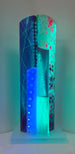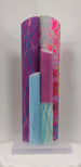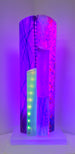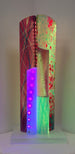 The concept of a 360 degree painting intrigued Ray Zovar but had it's challenges. A cylindrical painting would be fascinating, but the biggest issue was the size of the cylinder in relation to an abstract expressionist composition: the viewer only sees half of the painting at a time. This made it critical to assure compositional continunity, to maintain a relationship with every viewing angle. Zovar wanted his creation to present a new painting with each step around it. He first tried using sunlight to infuse life into the painting. Then, he tried using a base light, which added luminosity. Finally, he incorporated RGB LED strip lights within each piece; that changed the painting's composition. The result is a 260 degree illusionary, abstract, one-of-a-kind, interplay of color and light. Remote-controlled LEDs change the look, color, and intensity of the piece at your whim. The light can be brighter or darker and change colors faster or slower.