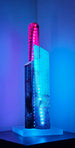 The concept of a 360 degree painting intrigued Ray Zovar but had it's challenges. A cylindrical painting would be fascinating, but the biggest issue was the size of the cylinder in relation to an abstract expressionist composition: the viewer only sees half of the painting at a time. This made it critical to assure compositional continuity, to maintain a relationship with every viewing angle. Zovar wanted his creation to present a new painting with each step around it. He first tried using sunlight to infuse life into the painting. Then, he tried using a base light, which added luminosity. Finally, he incorporated RGB LED strip lights within each piece; that changed the painting's composition. The result is a 260 degree illusionary, abstract, one-of-a-kind, interplay of color and light. Remote-controlled LEDs change the look, color, and intensity of the piece at your whim. The light can be brighter or darker and change colors faster or slower.