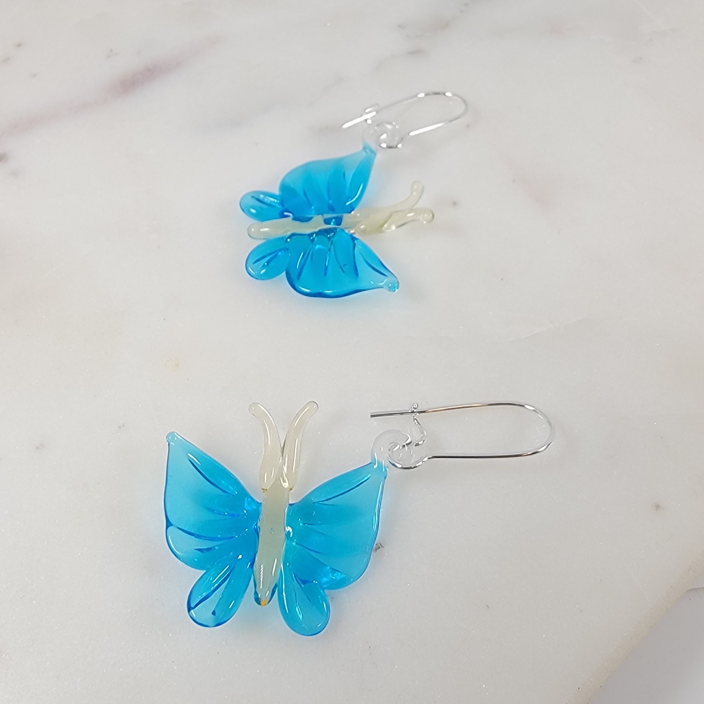 Handmade, lamp worked glass pair of miniature butterfly earrings.