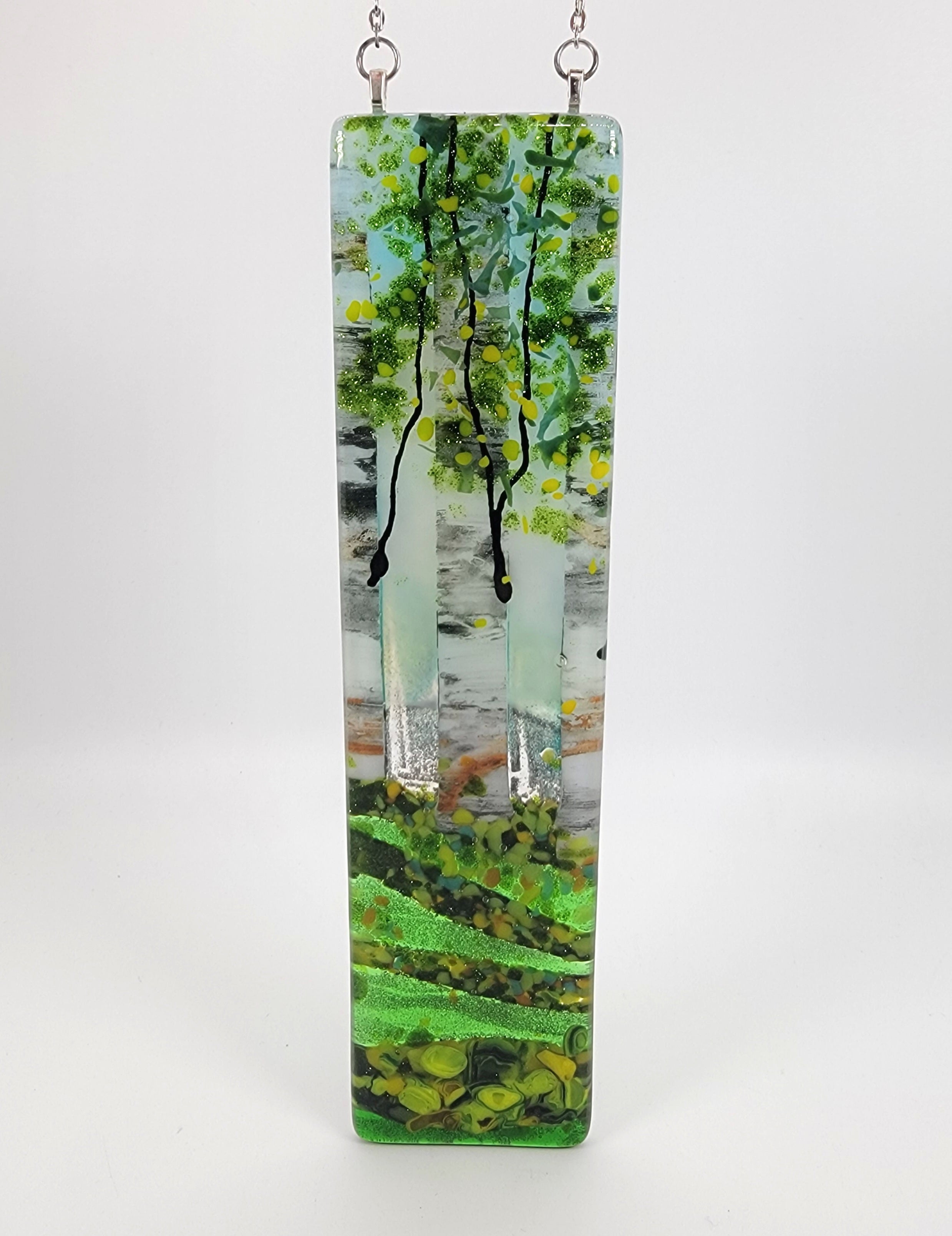 Tim McCoy and Kathy Marchlinski's hand painted, layered glass, fully fused plates feature various birch trees and wildflowers in beautiful opaque and transparent colors. Be reminded of birch tree forests year round while hanging this piece in your window.
