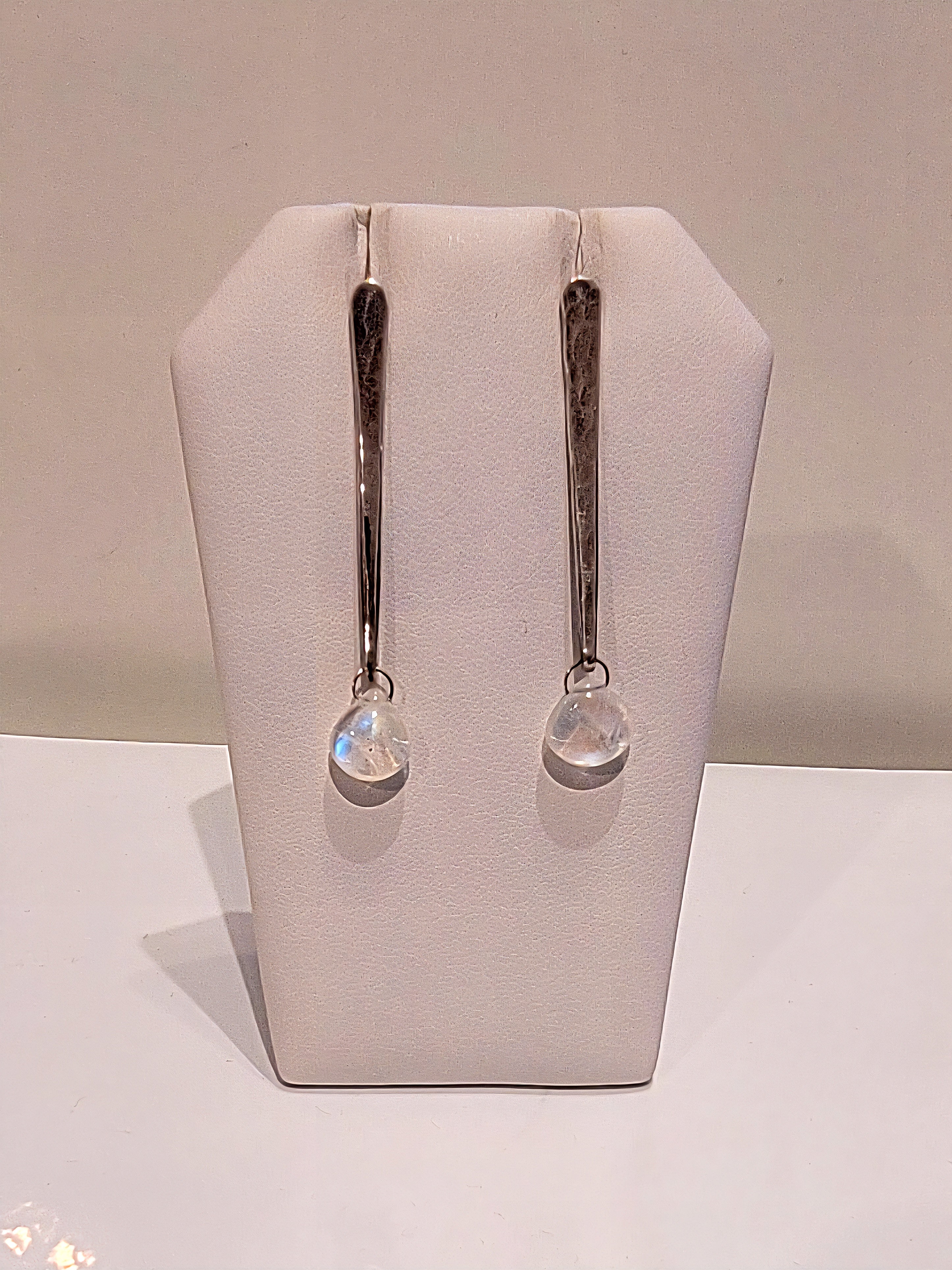 These earrings are simple yet tactile, featuring thick sterling silver wire that has been meticulously forged into a tapered wedge shape and hammered for incredible texture and sparkle. The facets are created by the hammering catch light beautifully, adding a touch of glamour to any outfit. The Moonstones dangle from the wedge shaped post earring, creating a dynamic and eye-catching movement!