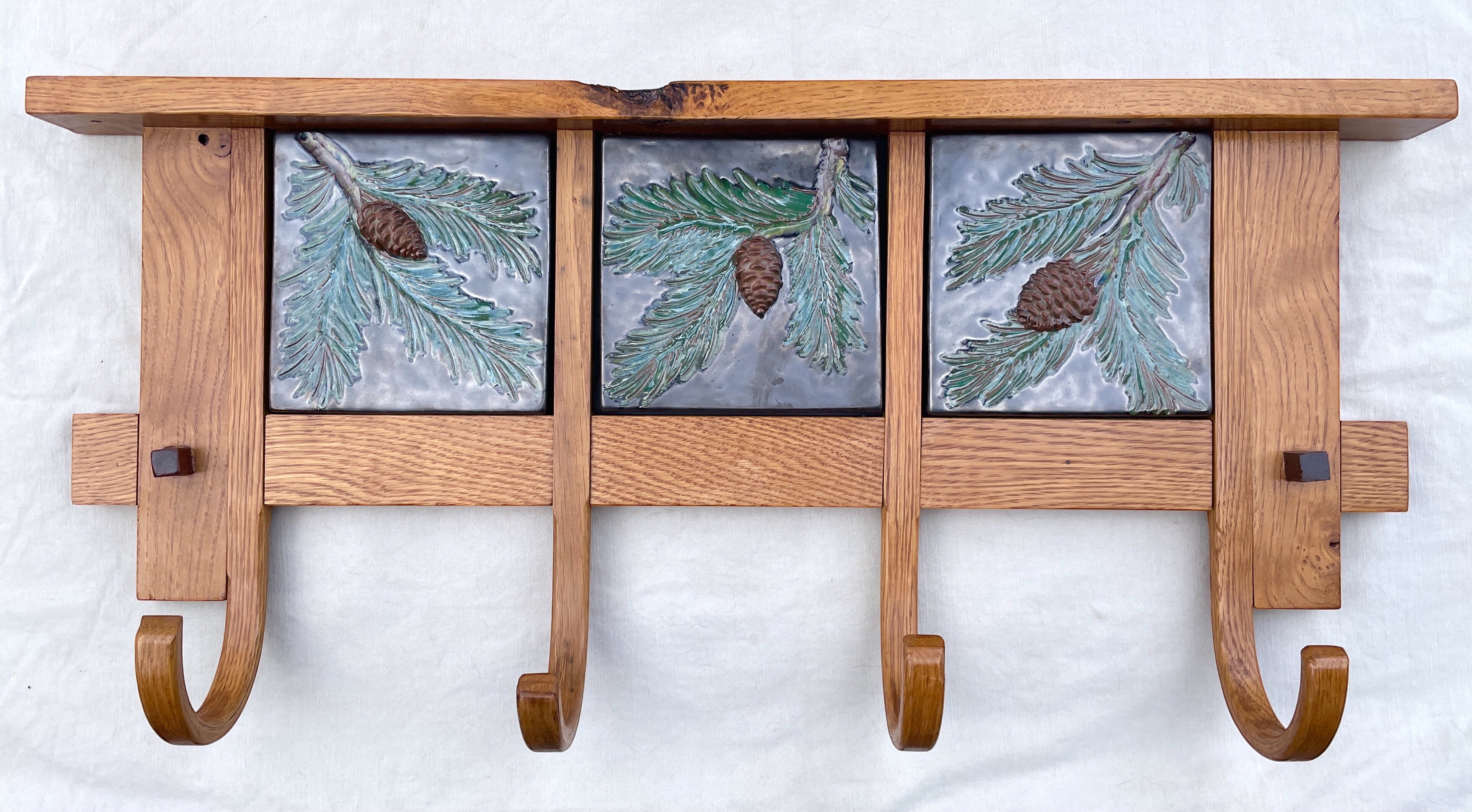 Art meets function in this handcrafted live edged & bent wood white oak coat rack with three glazed terra cotta tiles featuring pine branches with a pinecone—where earthy elegance and everyday utility come together. The tiles are sculpted from richly hued clay and fired to perfection, each piece features warm, natural tones and subtle texture that bring a grounded beauty to your entryway or mudroom.