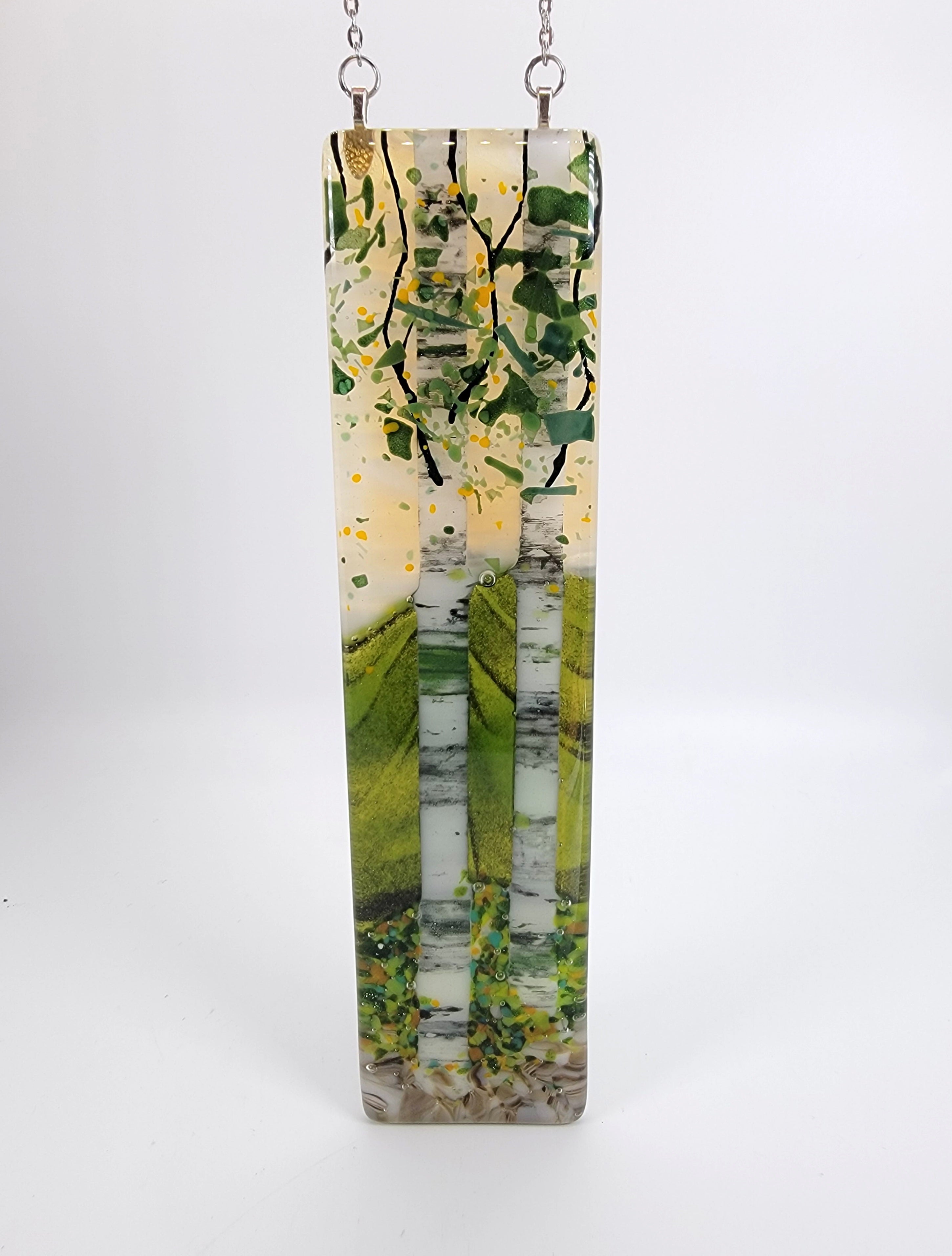 Tim McCoy and Kathy Marchlinski's hand painted, layered glass, fully fused plates feature various birch trees and wildflowers in beautiful opaque and transparent colors. Be reminded of birch tree forests year round while hanging this piece in your window.