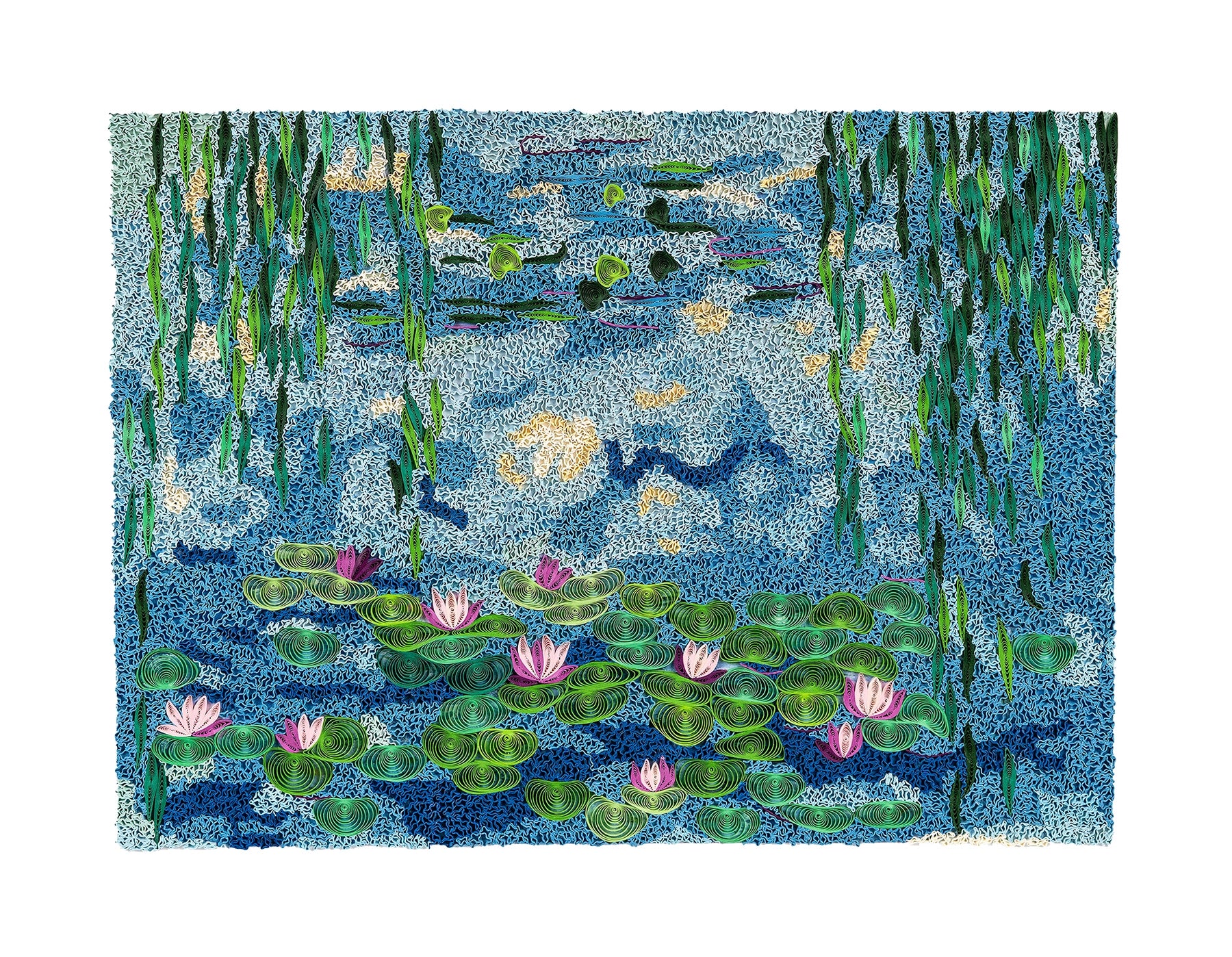 Introducing the exquisite quilled wall art piece, inspired by Monet's "Water Lilies." Water Lilies 1916–19 was painted by the French artist Claude Monet in 1916. This is one out of 250 Water Lily paintings done by Monet from 1897 to 1926. Monet painted many horticulture scenes throughout his time at Giverny where he worked with gardeners and landscapers to perfectly curate the grounds to his wishes, complete with his iconic lily pond.