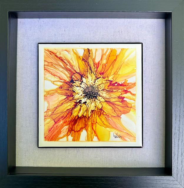 Alcohol inks are brightly colored, acid-free, dye based paints that create free flowing textures and design. They are fast drying and evaporate quickly, requiring a non-porous surface such as synthetic paper, ceramic tile, or a specially prepared canvas. This piece has been sealed with 3 coats of Lamar Varnish and UV archival protection.