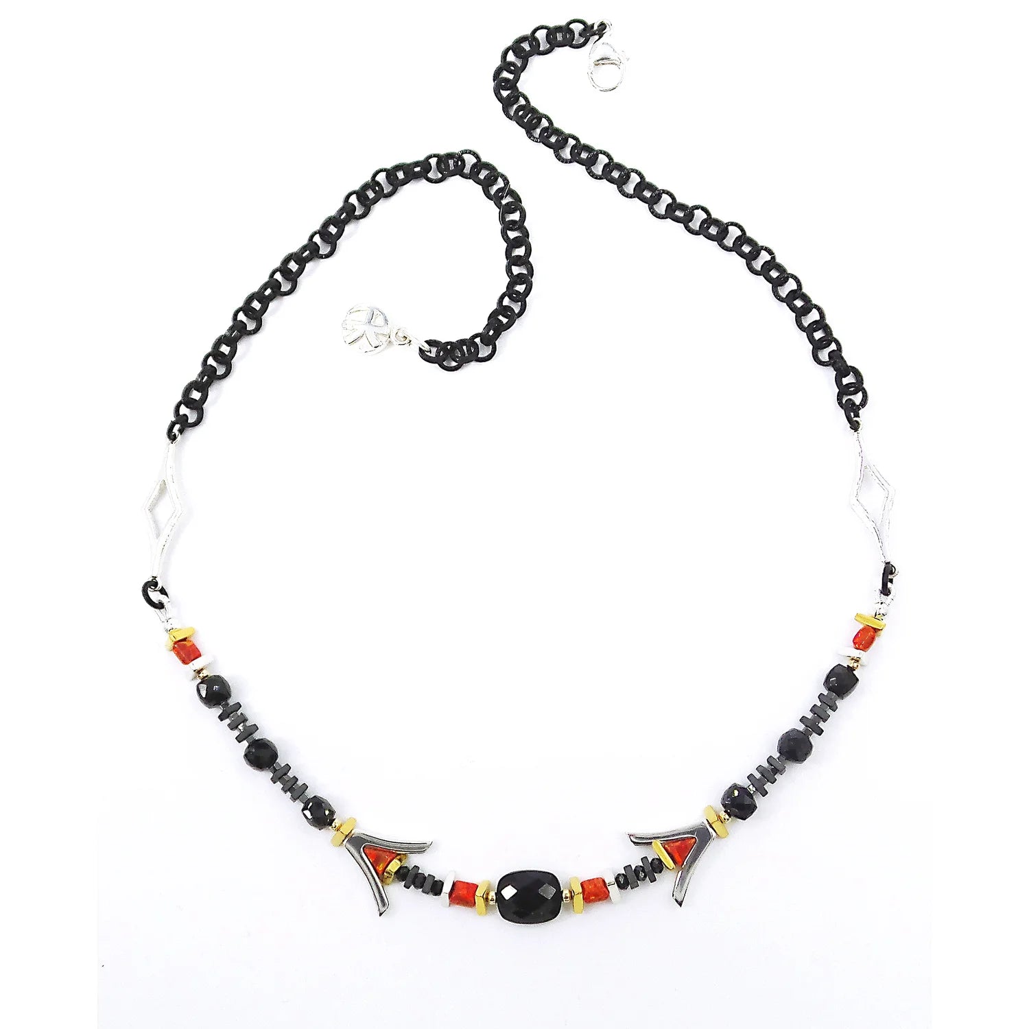Red opal, black garnet spinel, hematine, 22K gold vermeil, fine silver, and matte black chain