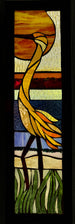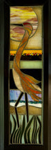 Each stained-glass mosaic is a one-of-a-kind created by artist Bonnie Nygard who incorporates both traditional stained glass and mosaic techniques into her artwork. Stained glass is cut into unique designs and adhered to the clear glass. Regal Crane is filled with texture, including beads, and features a beautiful crane at sunset.