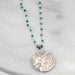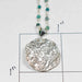 This necklace features a reticulated sterling silver disc that hangs from a 16" - 18" sterling silver chain featuring small turquoise gemstones.