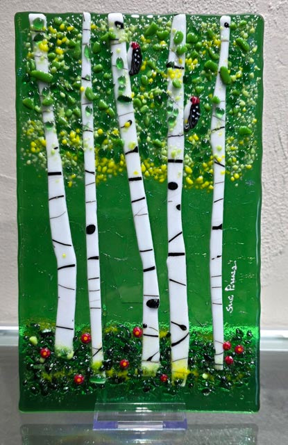 For 60 years, this passion for art lay dormant, but upon retirement, her true calling was unveiled: transforming sheets of glass into captivating art. Sue specializes in crafting vibrant kiln-formed landscapes, focusing on the intricate beauty of flowers and trees. Each petal and branch is hand-cut, allowing her creativity to flow naturally and organically.