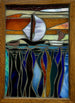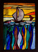 Each Stained Glass Mosaic is one-of-a-kind created by Bonnie Nygard. Using recycled windows, stained glass is cut into unique designs and adhered to the window pane. This contemporary piece fills the water with bursts of color as the boats above calmly sail away.