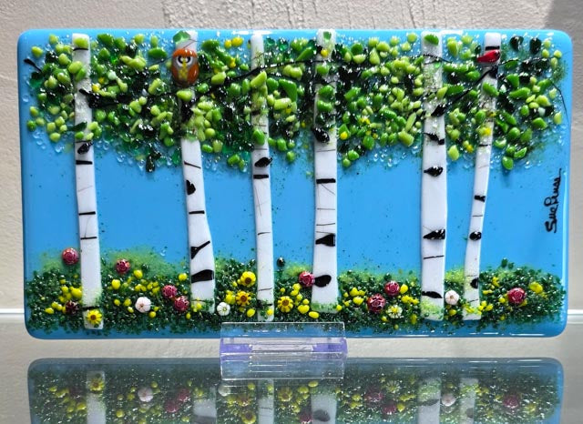 For 60 years, this passion for art lay dormant, but upon retirement, her true calling was unveiled: transforming sheets of glass into captivating art. Sue specializes in crafting vibrant kiln-formed landscapes, focusing on the intricate beauty of flowers and trees. Each petal and branch is hand-cut, allowing her creativity to flow naturally and organically.
