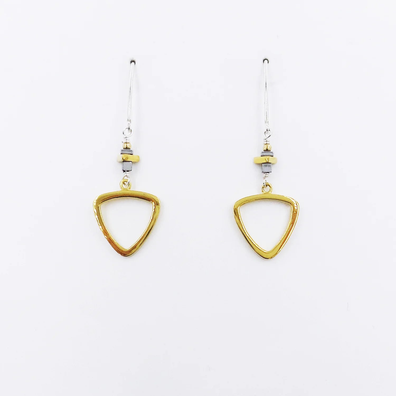 Be mesmerized with Arlee Kasselman's handcrafted jewelry. Each piece is unique, filled with color, and ready to be added to your jewelry box! These sterling silver earrings feature a 22K gold vermeil drop triangle and are guaranteed to shine in any light. Simple and elegant but a must have for every collector.