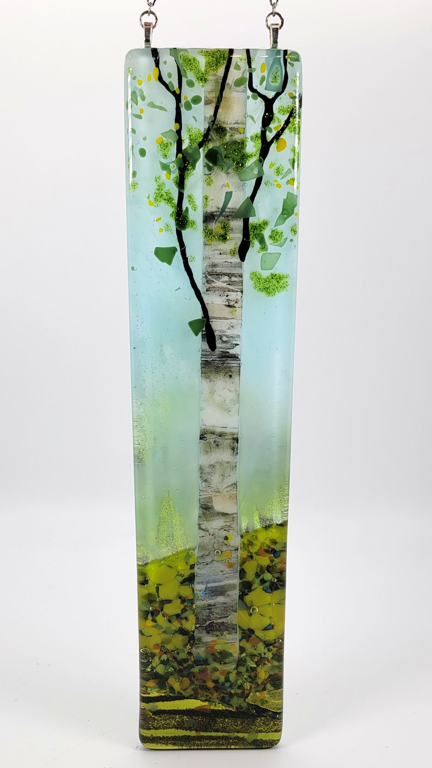 Tim McCoy and Kathy Marchlinski's hand painted, layered glass, fully fused plates feature various birch trees and wildflowers in beautiful opaque and transparent colors. Be reminded of birch tree forests year round while hanging this piece in your window.