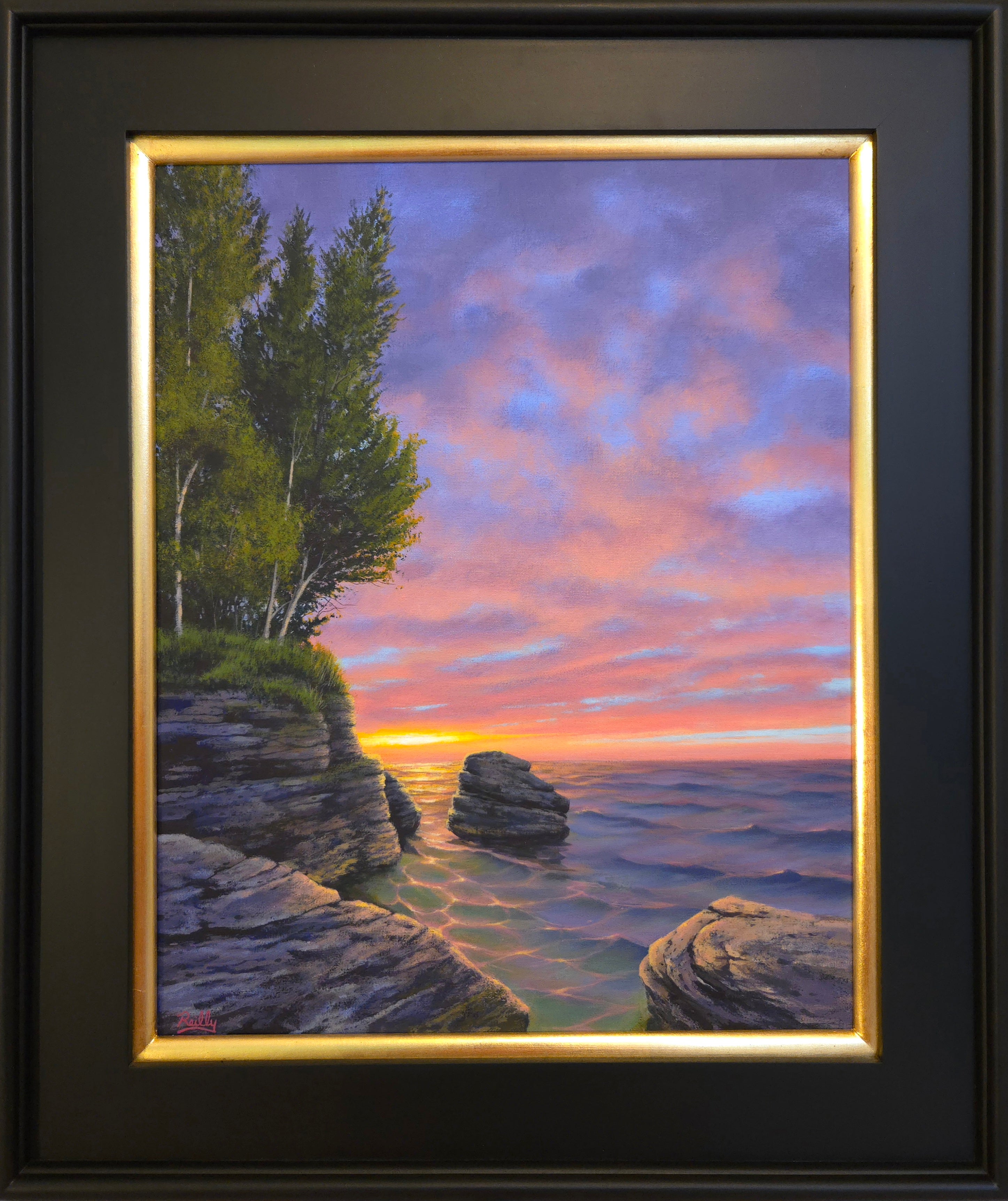 The sunrise over the rocky Lake Michigan coastline was painted en Plein Air at Cave Point County Park.