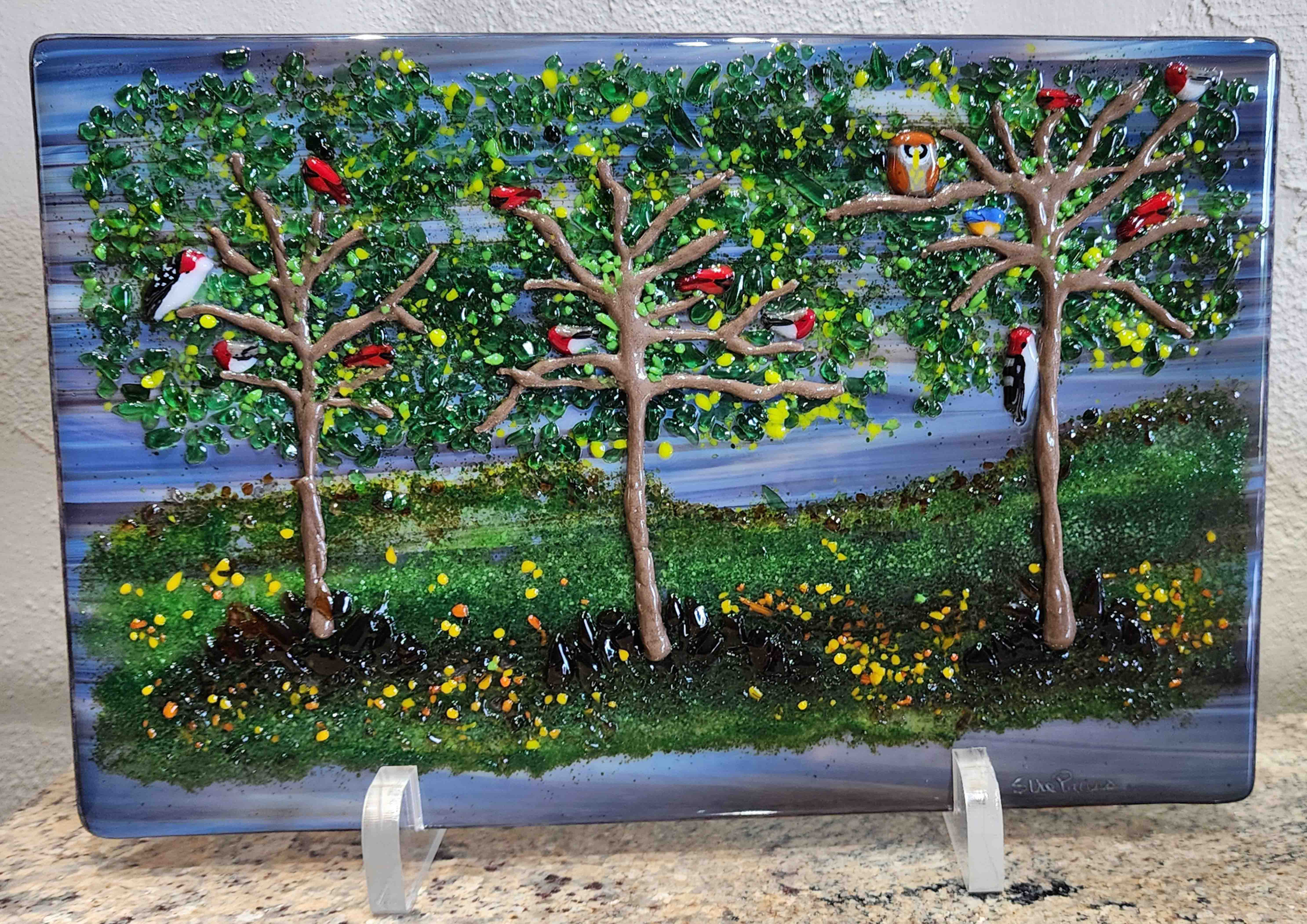 For 60 years, this passion for art lay dormant, but upon retirement, her true calling was unveiled: transforming sheets of glass into captivating art. Sue specializes in crafting vibrant kiln-formed landscapes, focusing on the intricate beauty of flowers and trees. Each petal and branch is hand-cut, allowing her creativity to flow naturally and organically.