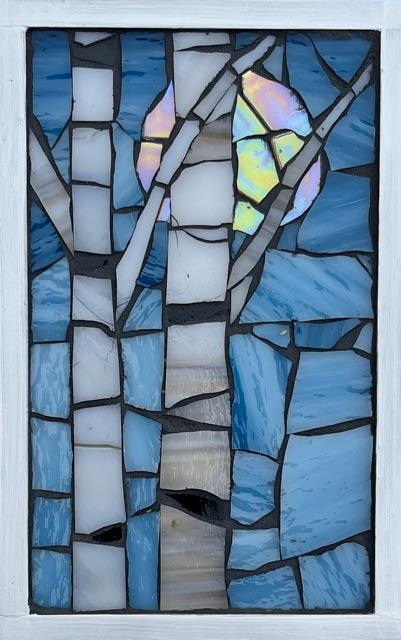 Each of Kellie’s pieces begins with a conversation between the artist and the glass. The texture, color, or cut of the material often guides the direction of the work, sometimes leading to unexpected and delightful outcomes. Her passion for mosaic art shines through in every piece, and she considers it the highest compliment when one of her creations finds a new home through the gallery.