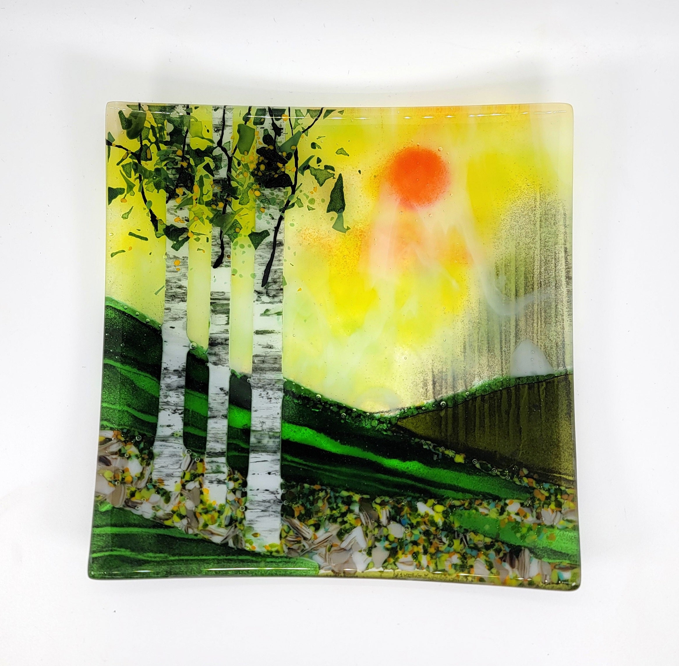 This one-of-a-kind plate features three birch trees in the foreground and a yellow sky with orange sun setting over green hills.