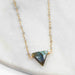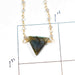 This necklace features a stunning triangle shaped labradorite gemstone and hangs from a 16" - 18" adjustable gold fill chain that features tiny labradorite gemstones.