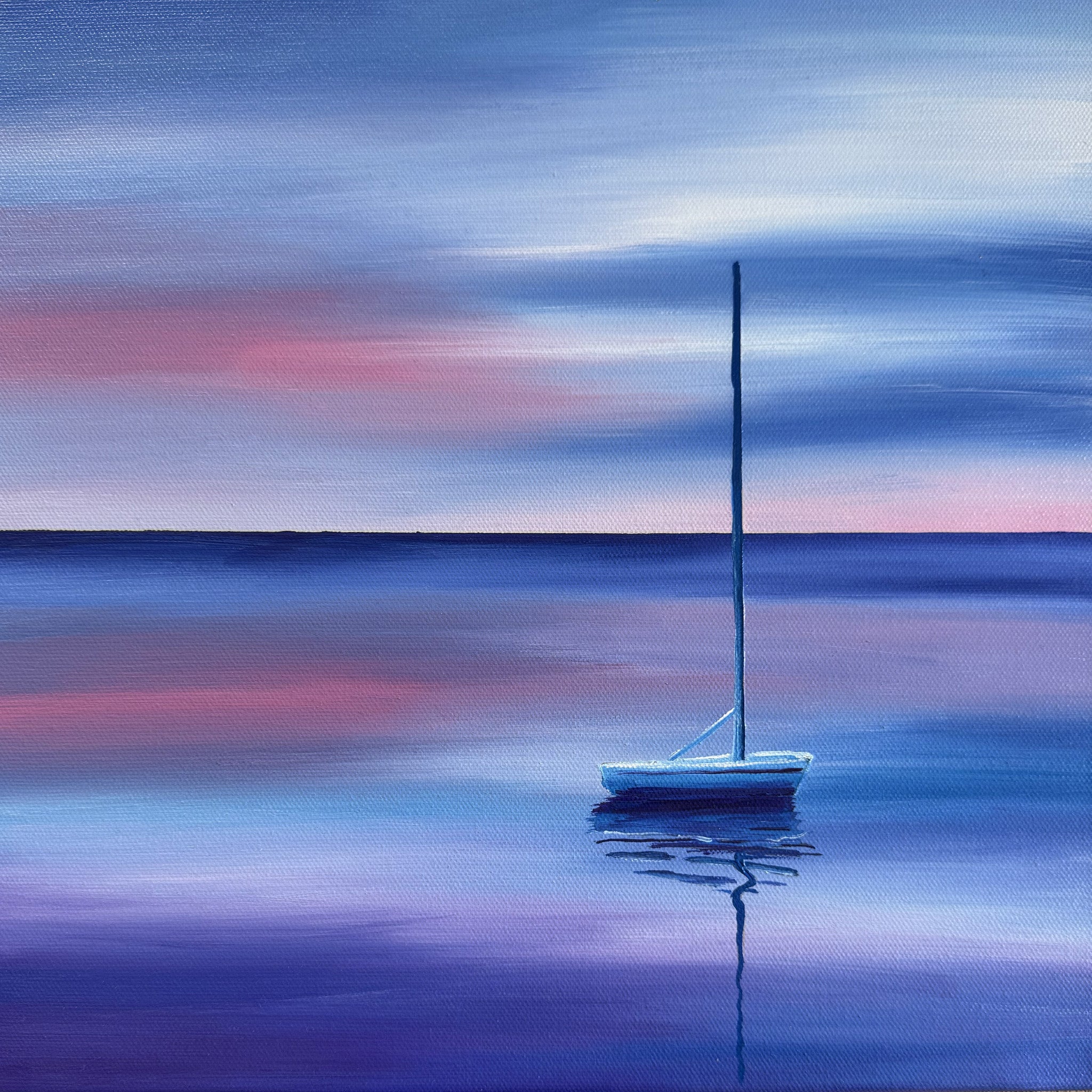 Tucked In is a reflection of Allen’s deep love for water and nature, shaped by his childhood summers along the Lake Michigan shoreline. His dynamic compositions capture the feeling of a glowing sky, the shimmer of water, and the peaceful rhythm of the coast—all brought to life through vibrant color palettes.