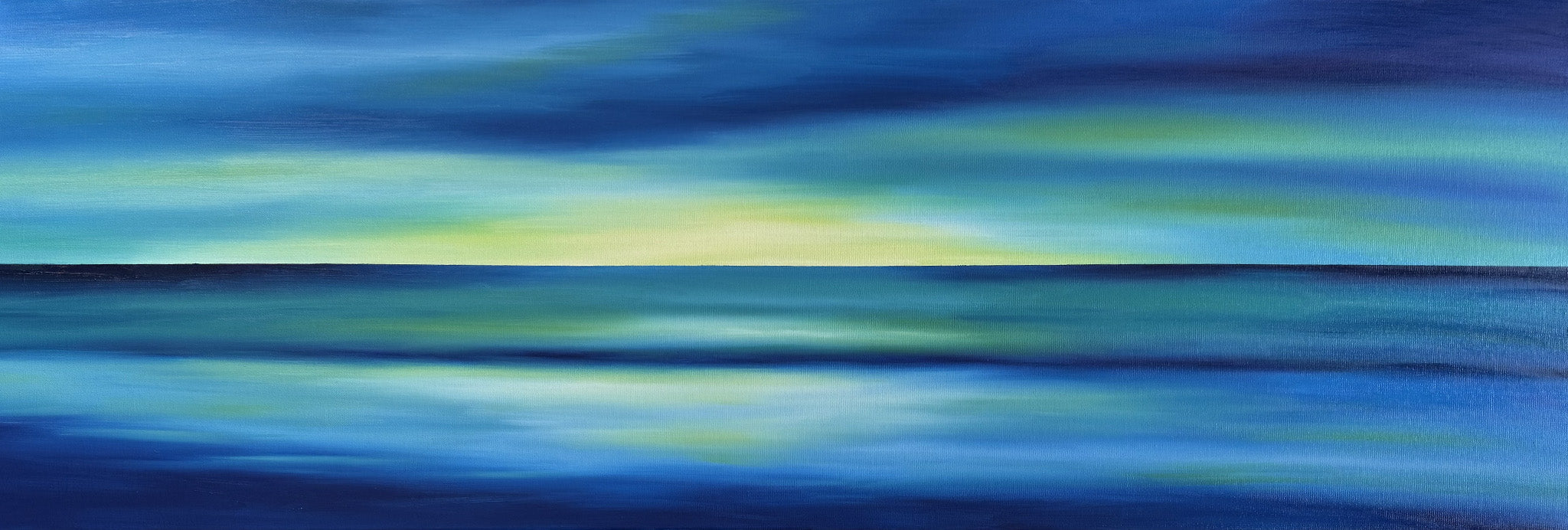 Turquoise Reflection features still blue-green waters with a sun hiding behind the horizon, evoking feelings of calm, freedom, and connection to nature. The rich backgrounds and subtle reflections invite viewers into a meditative, dreamlike world.